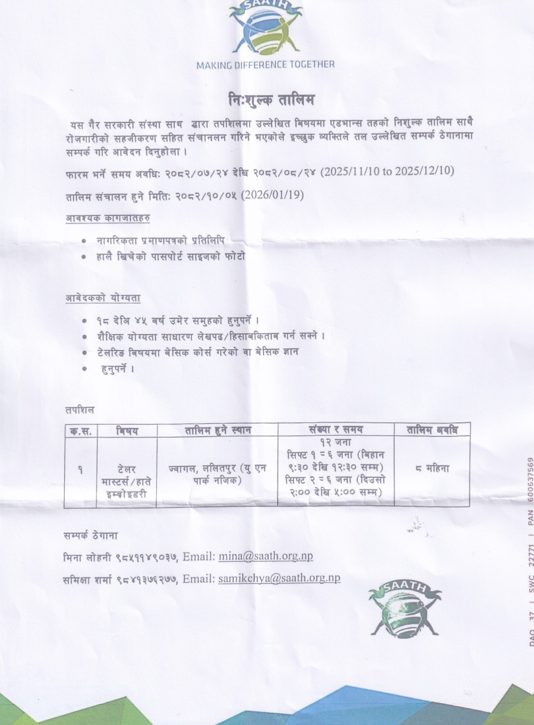 Those who are interested in learning tailor masters/hand embroidery, please contact the given number.